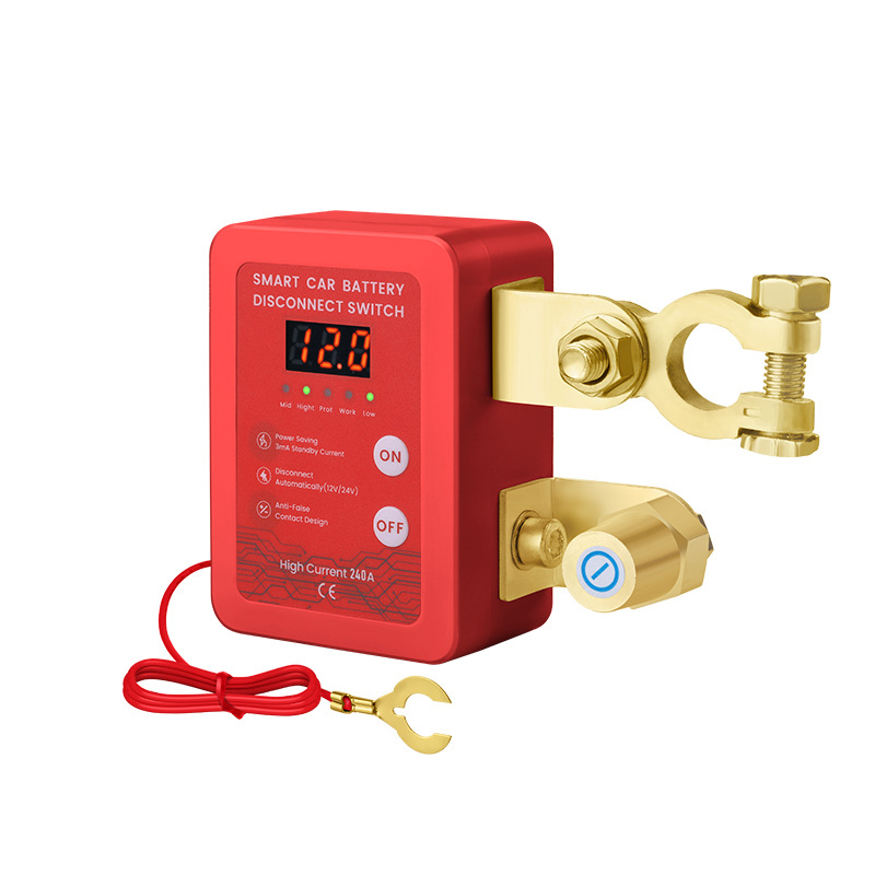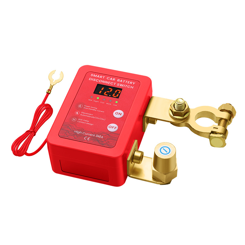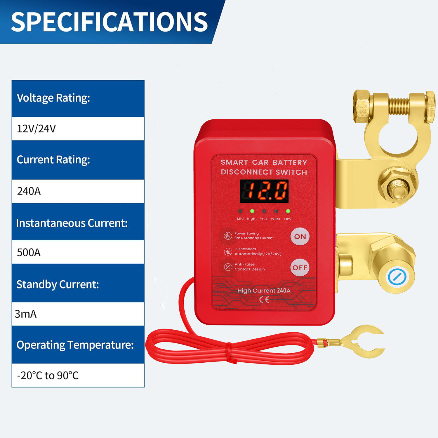 【Specifications】Battery disconnect switch rated current: 240A, rated voltage: 12V, standby current: 3mA, instantaneous current: 500A.