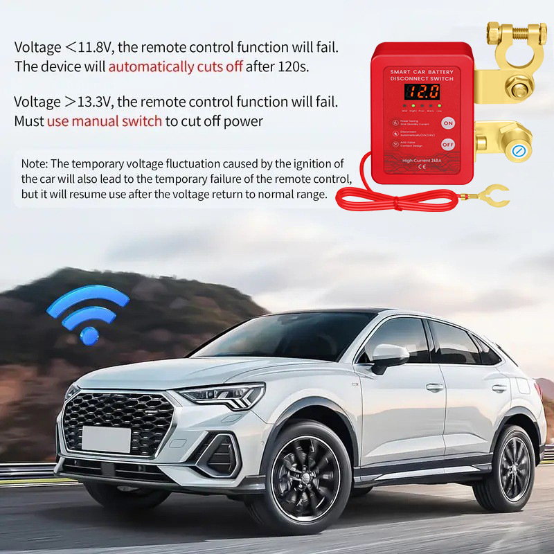 【Intelligent Led Voltage Display】The LED voltage display detects the battery voltage at any time, if the voltage is lower than 11.8V, the remote kill switch will automatically cut off the power supply after 120s to save electricity. If the voltage is higher than 13.2V, the remote control will be disabled to prevent accidental action to turn off the power while driving, and the power supply can only be controlled by the button on the switch.