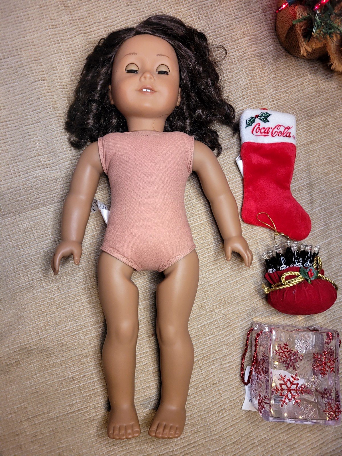 The American Girl Truly Me Doll #44, Tree, & Accessories are in good to new condition. Included is her meet, which has never been used, dress, jacket, & shoes, a new mini elf, AG panties, a new acrylic bag, ornaments, presents, a Coca Cola ornament and stocking, floor mat, Christmas tree with lights, a new non-AG outfit(headband, dress, tights, & boots). The doll is in good condition. She can stand on her own, has long strings, good working eyes, pretty curly hair, & no stains or odors. She may have shine marks from play.