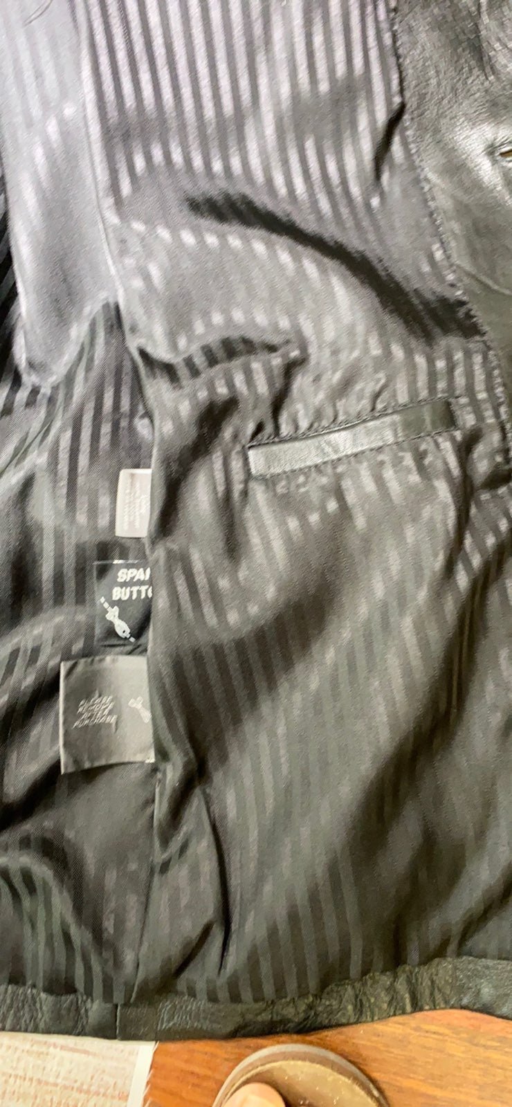 Apt. 9 Men’s Black Leather Jacket size 44L. Took Tags off and never worn. NWOT. 4 front button closure. Spare button inside. Nice black on black lining: 3 front pockets and one inside. Buttons on sleeves. Nice collar. Shoulder pads. 33 inches long. Bundle and save