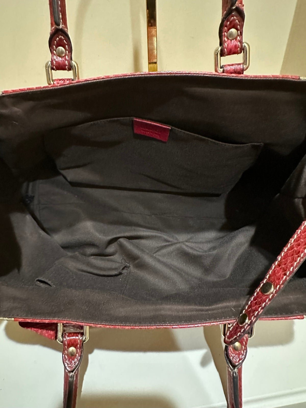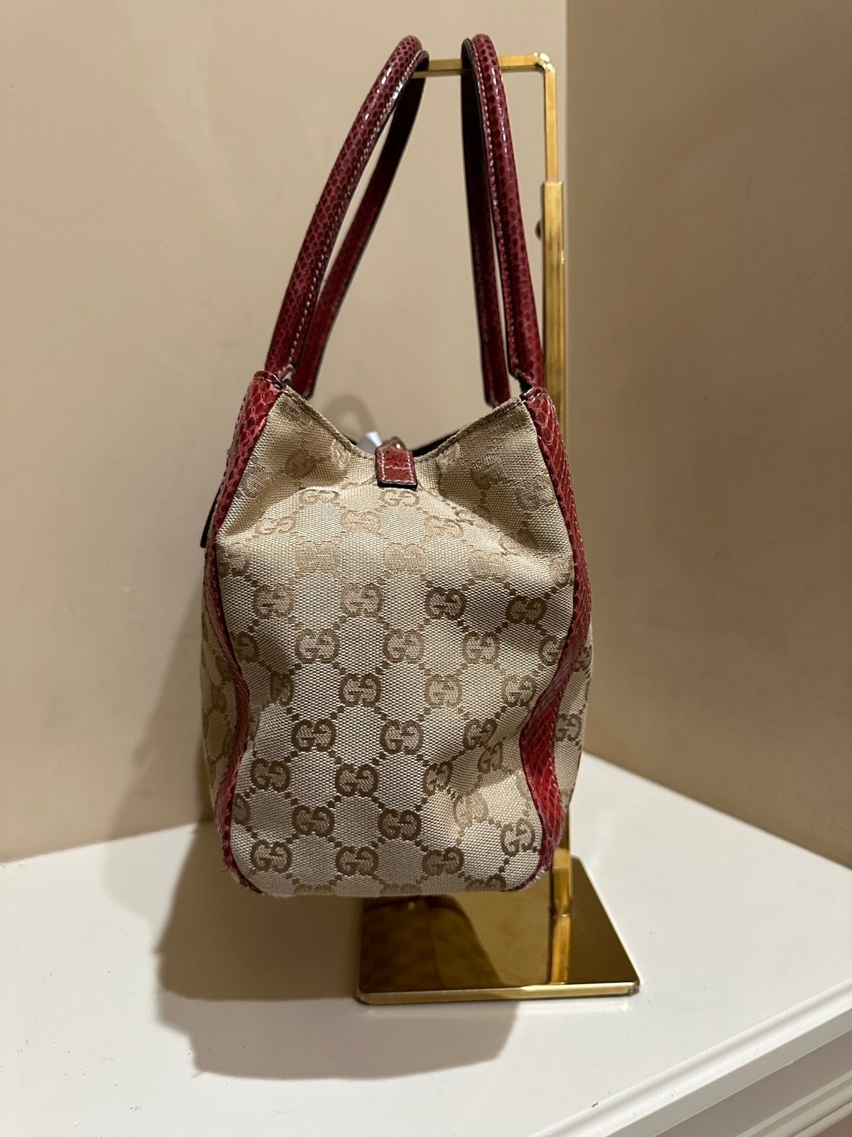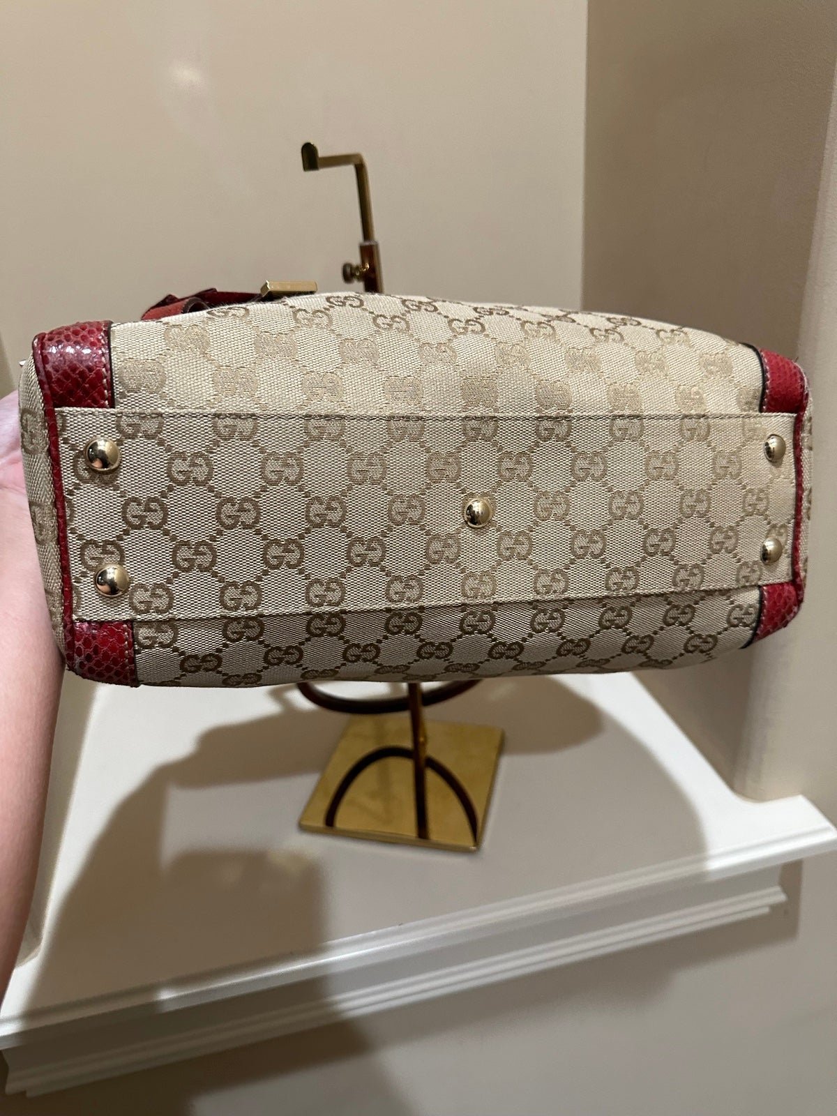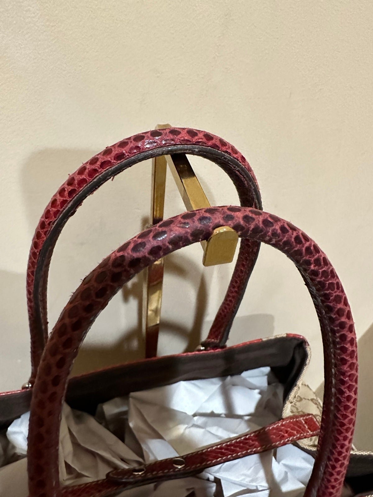 Nice used Condition Gucci Beige Canvas Python Trophy Tote. It does have one flaw on the front which is missing Python Coverage on one of the straps which I have pictured, pointed out and discounted greatly compared to those prices online. This is still a very beautiful bag in what is stated used condition. With flaws I may have missed as I am human but try to cover very thoroughly and accurately. It is very clean on the interior. The snaps hold firmly and it is an open tote. The bow does bend a bit at the top from use of the handle. That is pictured as well. I have pictured serials and measurements as well. No corner wear to speak of and all feet are present. The handles show slight discoloration from use but are otherwise in good used condition. If you have any further questions please reach out and I will be more than happy to try and answer. Handle Drop: 6"