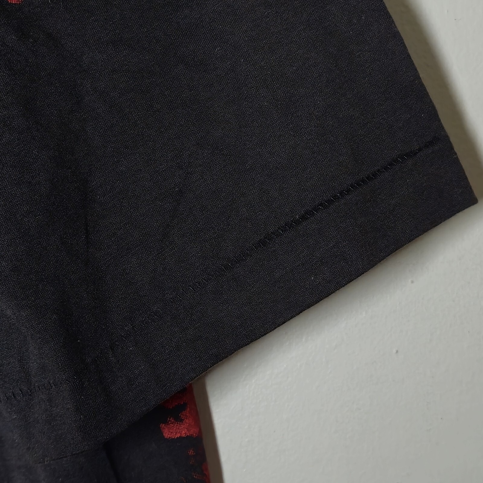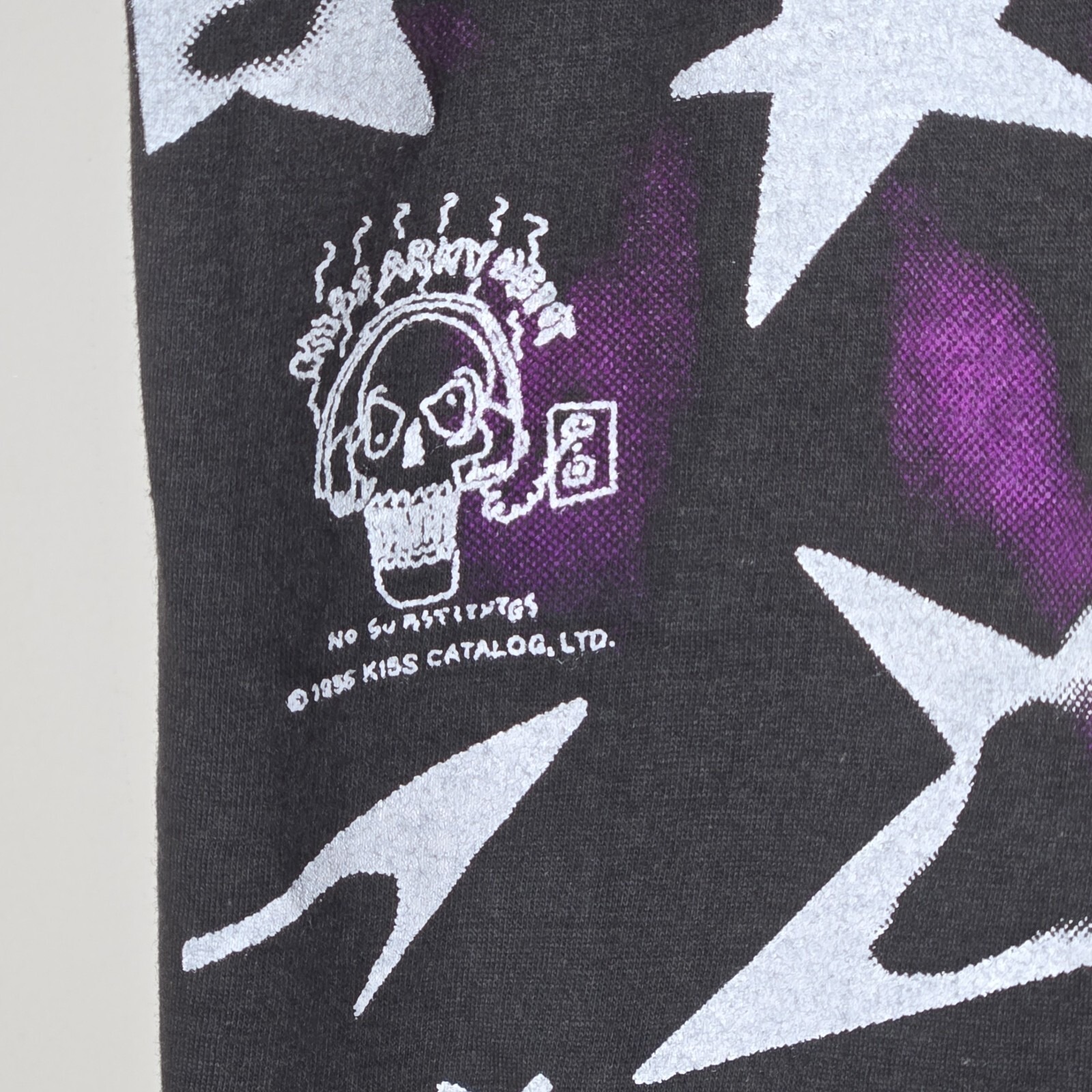 This is a modern reprint. This is a black XL men's t-shirt featuring a graphic print of Kiss from their Alive Worldwide Tour 96/97. The shirt has a crew neck, short sleeves, and is made of cotton. It has the Kiss logo as an accent and is double-sided. The t-shirt is designed in a rock music band theme from the 90s, suitable for all seasons and is manufactured in the United States.