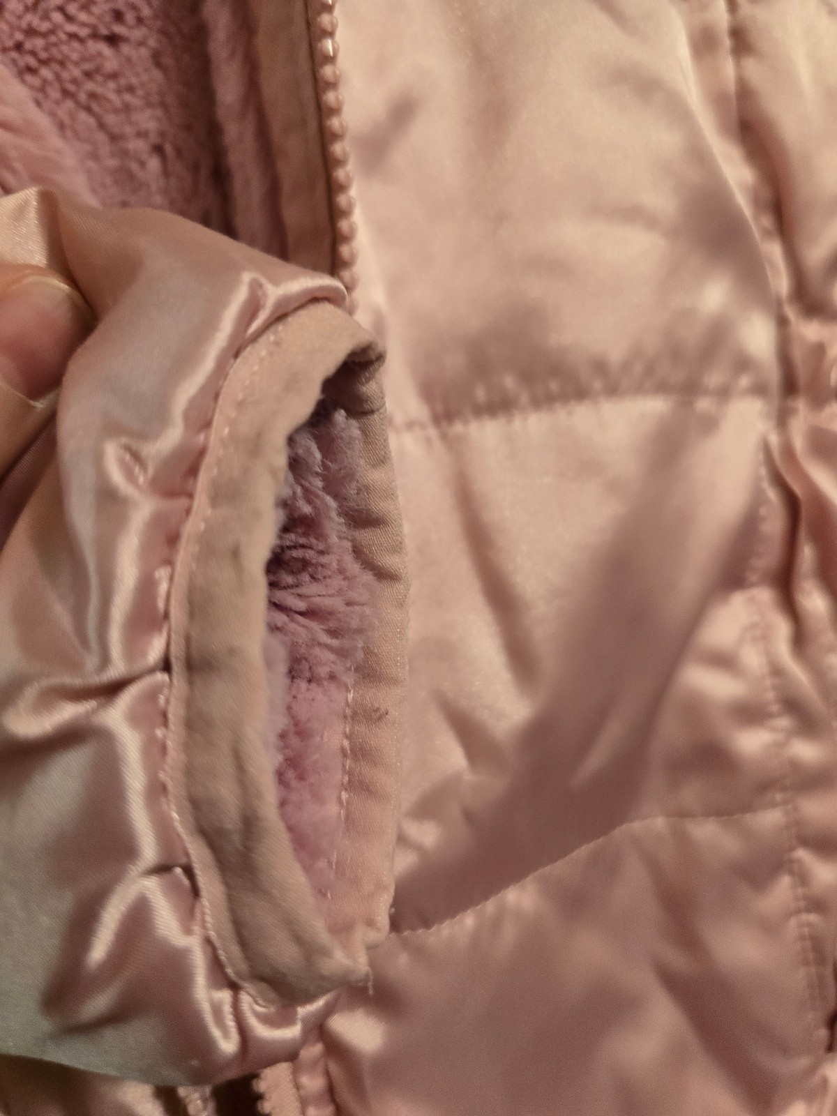 Pink reversible coat with soft inside. Good condition. May have small snags on the satin side from normal wear. Has a attached hood. Zipper in great condition. Please feel free to ask questions! Smoke free home.