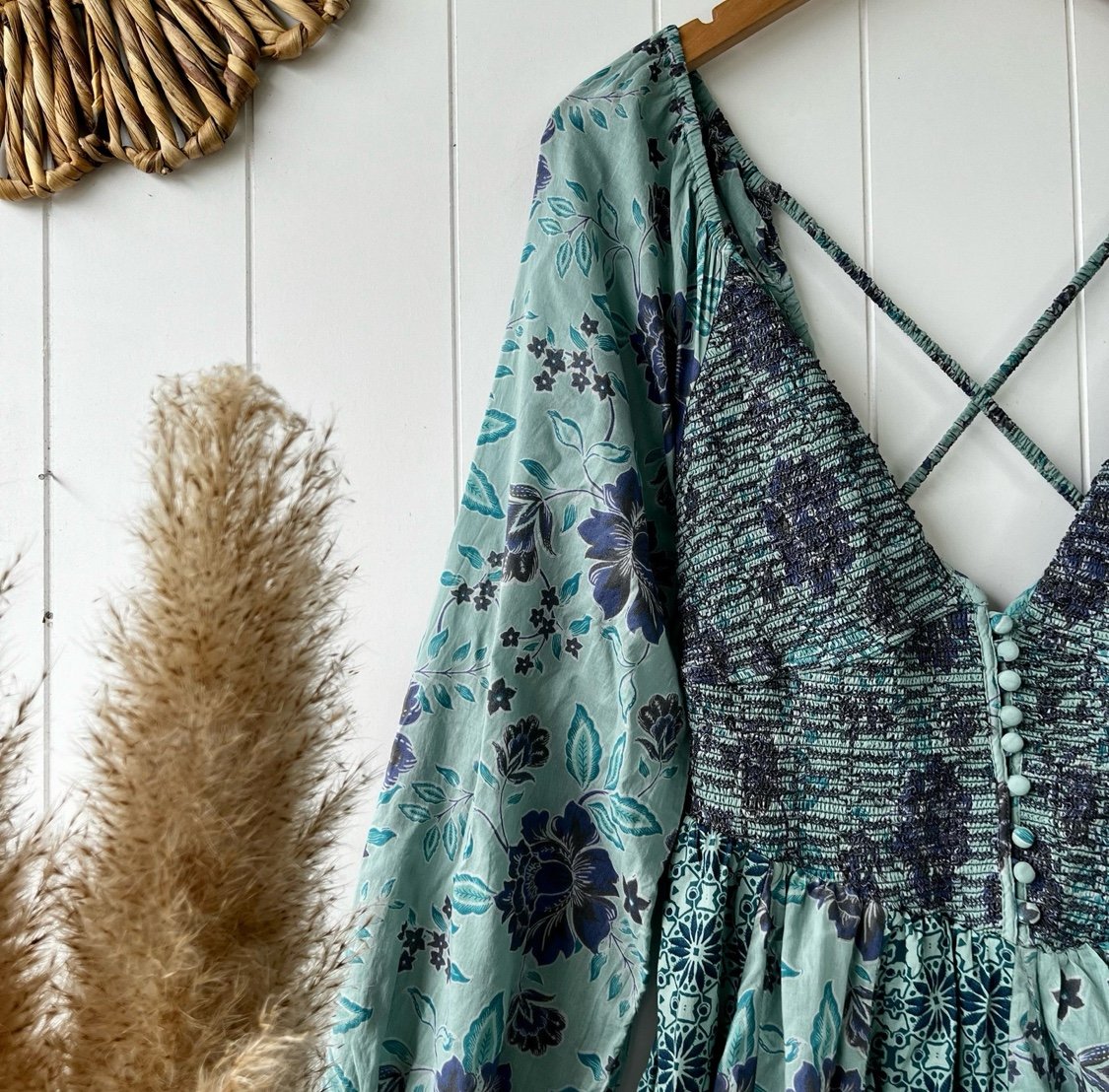 Features: Soft fabrication with printed detail all over, deep V-neckline, flattering smocked bodice with button-front detailing, side-seam pockets, crisscross backstraps, balloon-inspired sleeves with elasticated hems, lined