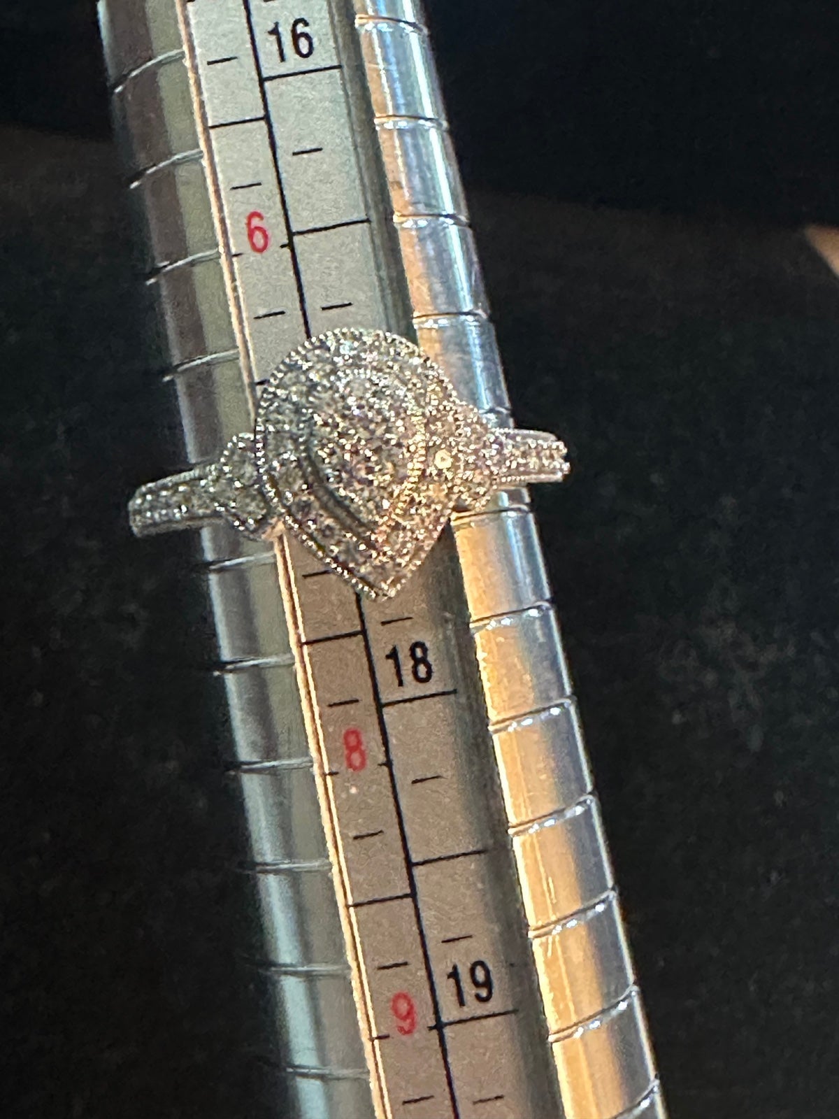 Just simply beautiful, loaded out with a lot of diamonds, approximately half carat diamond weight, in this pear or what you would call a teardrop shaped ring. Lots of sparkle in these good diamonds, size 6 3/4 can easily be resized if needed. Vintage look with beaded and pavé settings. Super good deal on this beauty. Great quality. The center is a cluster of diamonds with a halo around that and diamonds down the side. Smoke free home from a trusted seller. Please look at my timeline from any other beautiful listings.