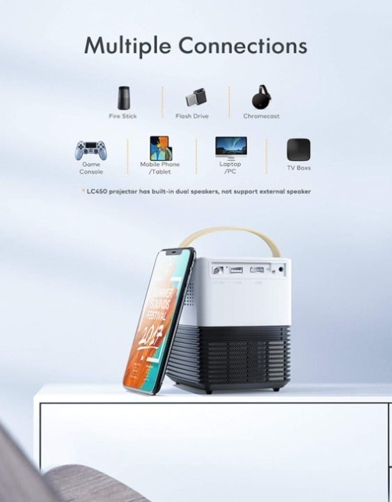 100" Large Screen & Dual Speakers: 100"Larger screen and low strobe LED light source. The portable projector lamp life to 50,000 hours. Equipped Dual Stereo speakers, The best gift for children. Enjoy home theatre with your family. (No AUX port).