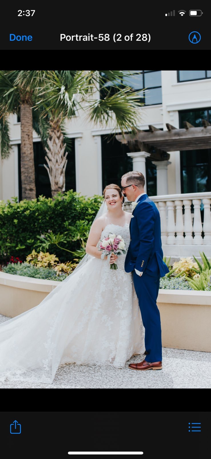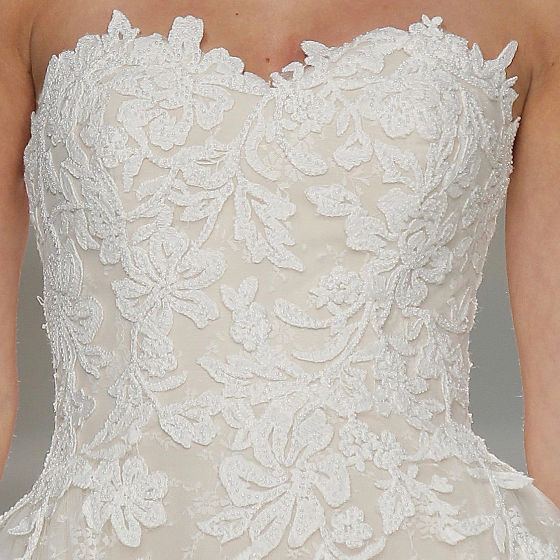 Pronovias released this glamorous wedding gown in the Spring 2018. Stock photos best represent the color and texture of the gown. Skirt has 6 beautiful layers. 2 layers of lace followed by 1 toffee colored sheer liner followed by 1 fluffy tulle layer between 2 white liners. Zip up back with button detail. Top layer of lace has large floral pattern with light beading on the bodice. The underneath layer of lace has a smaller, delicate floral pattern that adds to the glamor.