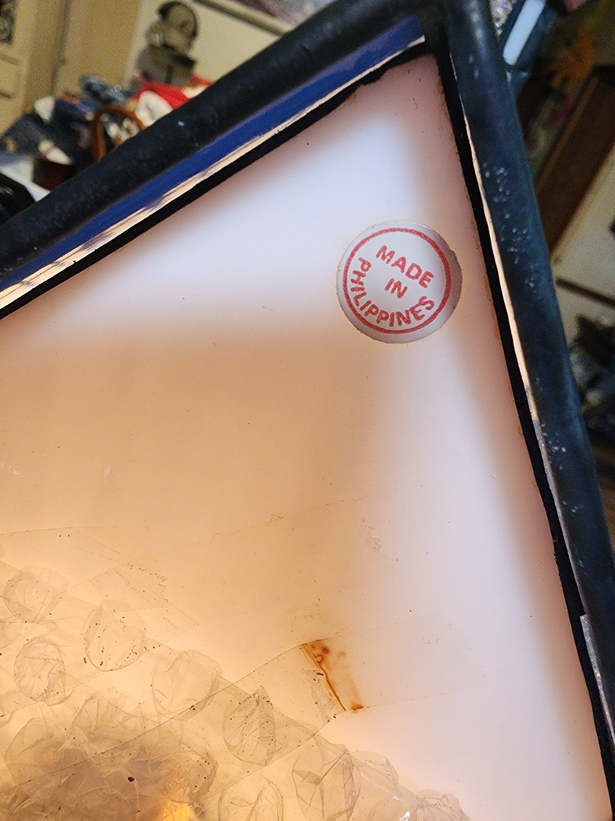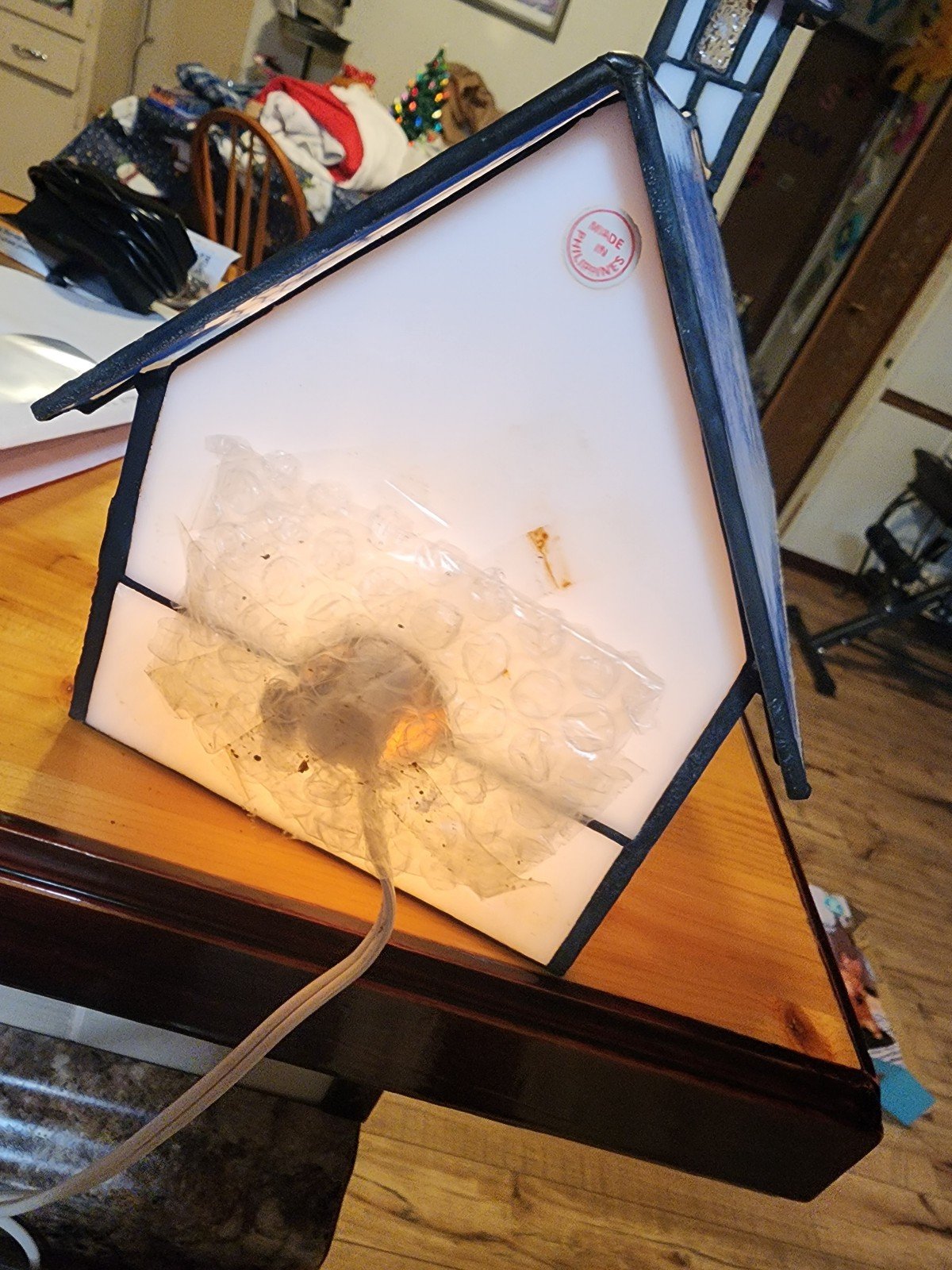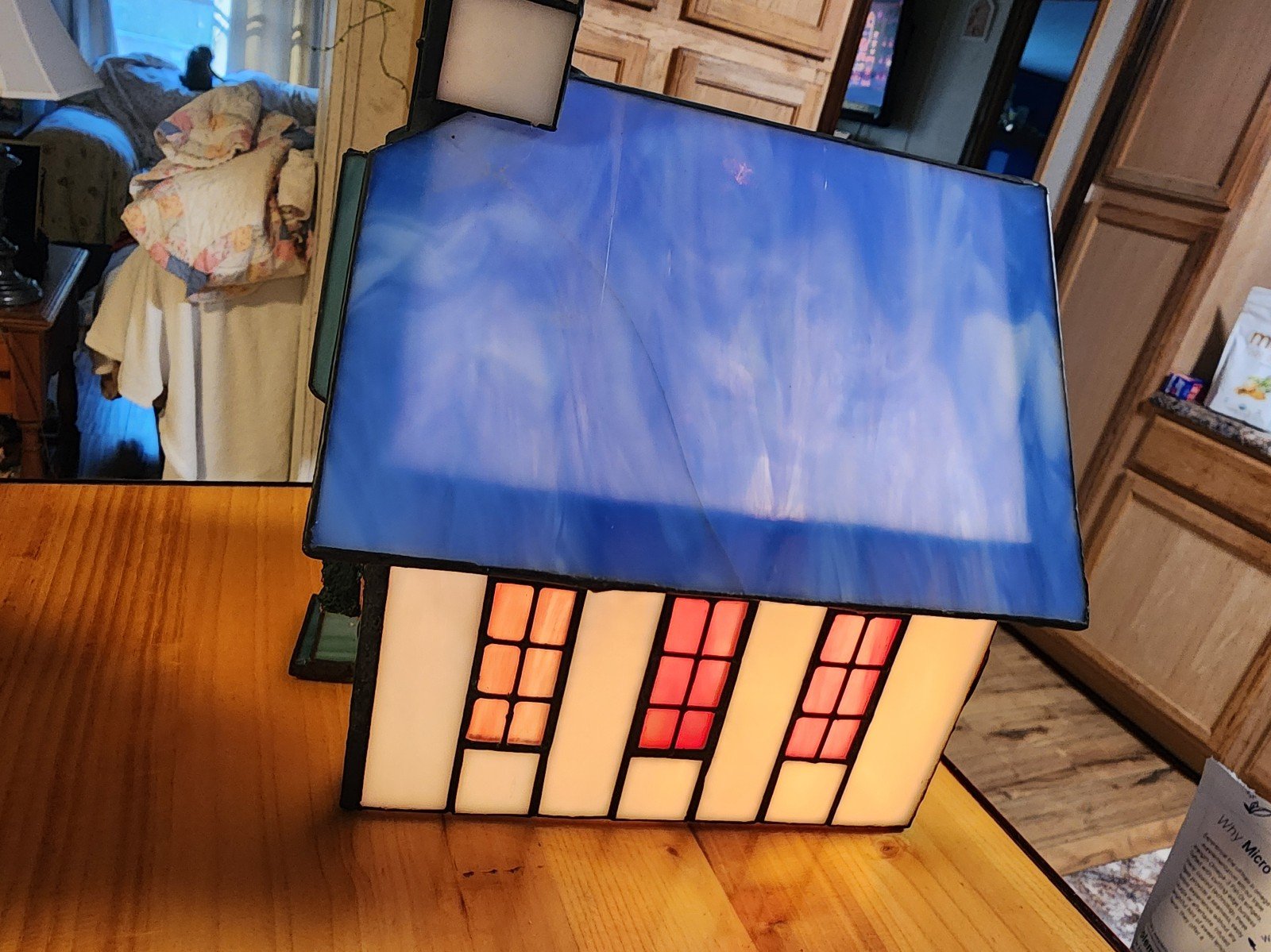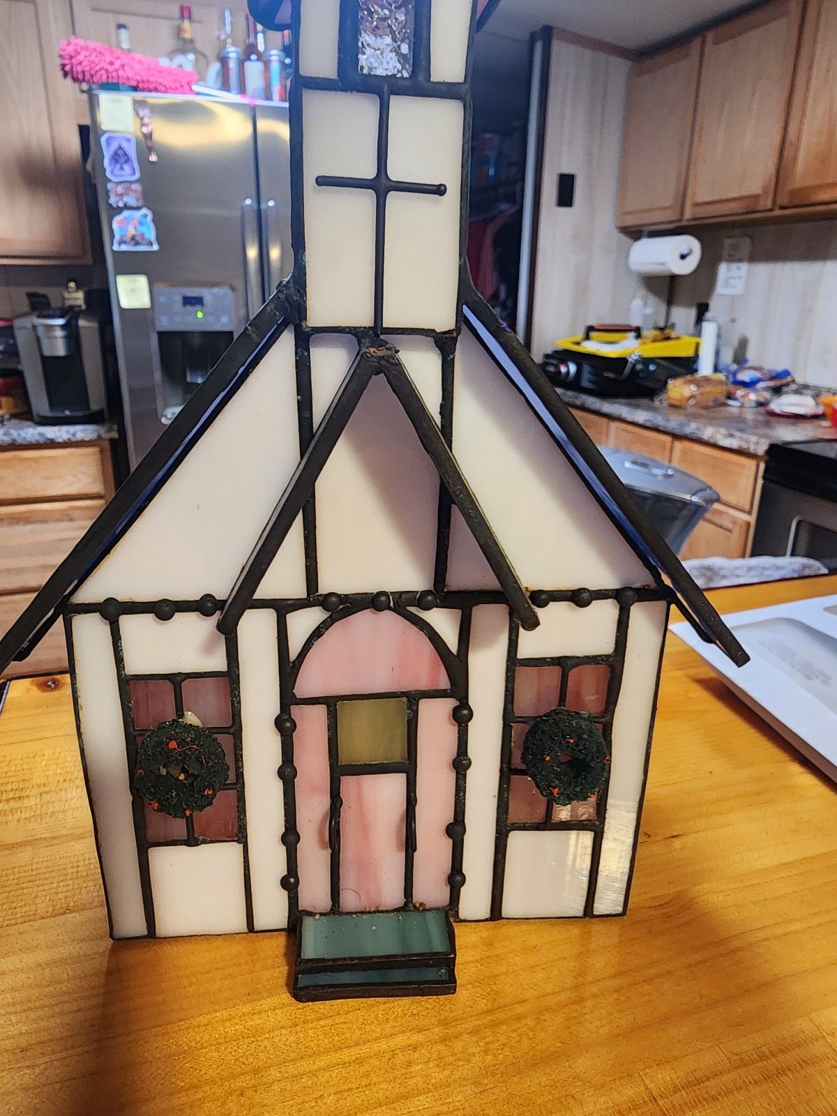 Stained glass village church. This piece is from the late 80's. Would make the perfect addition to any village. There is a crack as shown, been there since purchased.
