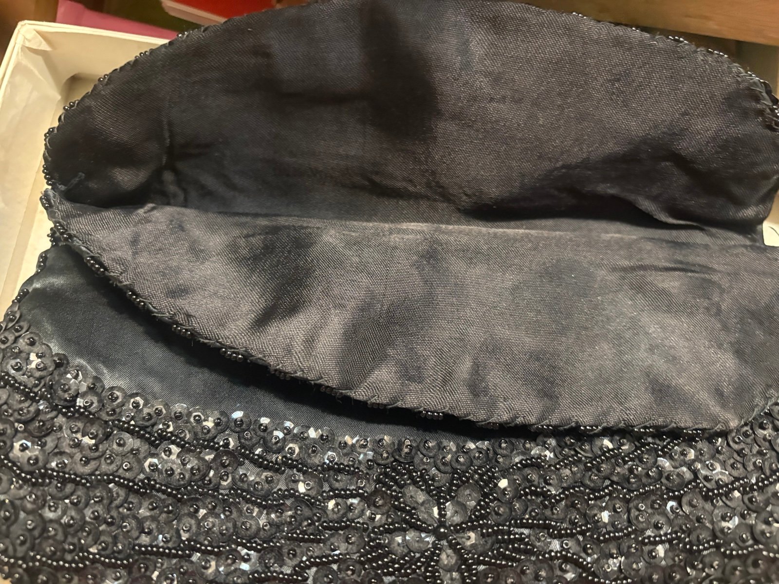 Elegant 1950s vintage Hand Made clutch purse with black beading fold over. See pictures for fetal and description. In mint condition with box. Has been kept in drawer. It can accommodate an essential like an iPhone. Features an interror pocket.