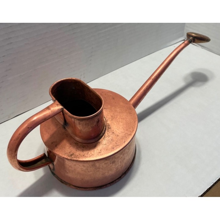 This is a beautiful vintage copper watering can in Haws Elliot style. I am unable to find markings though. It ‘s spout does turn to ensure no dripping until you want to use it. It is in very good condition with no dents. It is approximately 16"W x 7"H. Thank you!