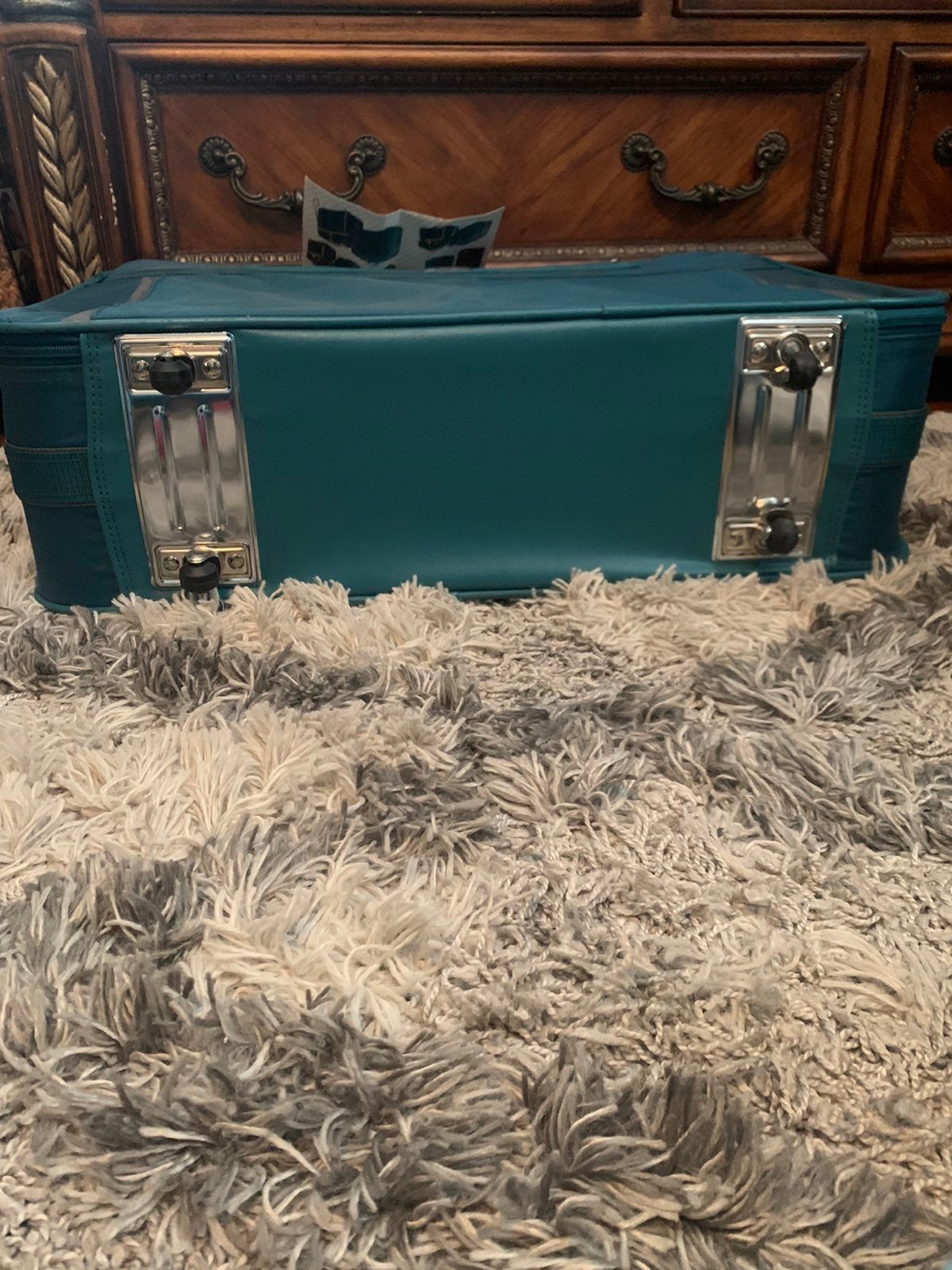 Opened only for photos. Brand new never used vintage Faberge expanded Collection luggage set. Color is a deep aqua blue with chrome accents. All pieces are intact and never touched. This is a rare set all together the color option, the condition, and the brand. Stored in a climate controlled dry setting.The more common look of the brand was actually a floral print. Asking price is firm this is set one of two and the other sold for just over $1000 at a private auction.