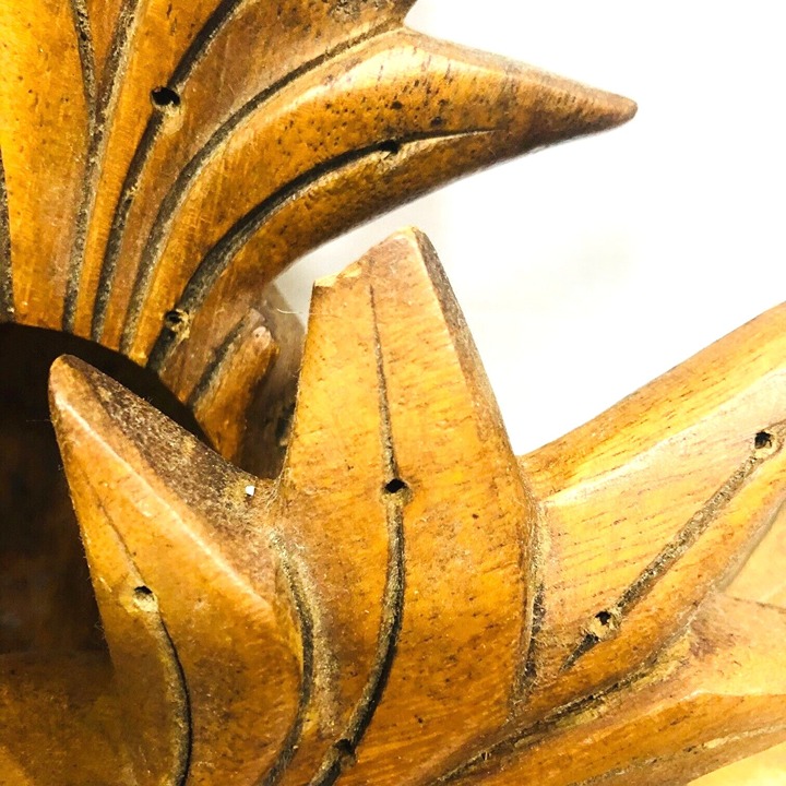 RK. Vintage. Monkey pod wood. Carved. MCM. Hand signed on bottoms, but really hard to make out - looks like Artist Blass Blac - "Woods of ?? Honolulu". "Monkey Pod Wood". This set includes six (6) 10.25x4.5x2.5 bowls, monkey pod fork and spoon, and one 18 x 10 x 4.5 serving bowl. Detailed carving. One broken tip on a small bowl (photo). Scalloped edges. The set shows some age, wear, and scrapes - no cracks. (photos).