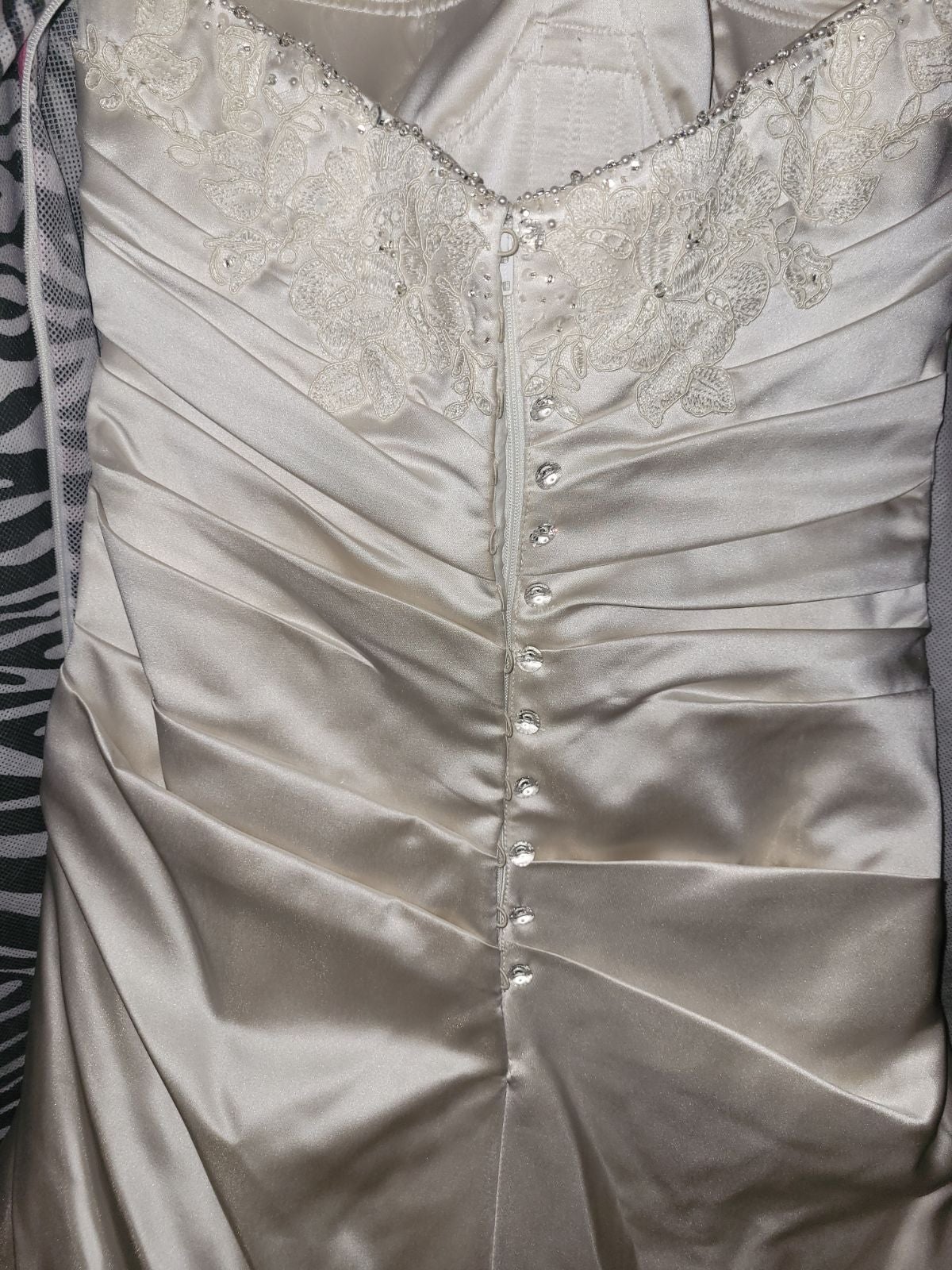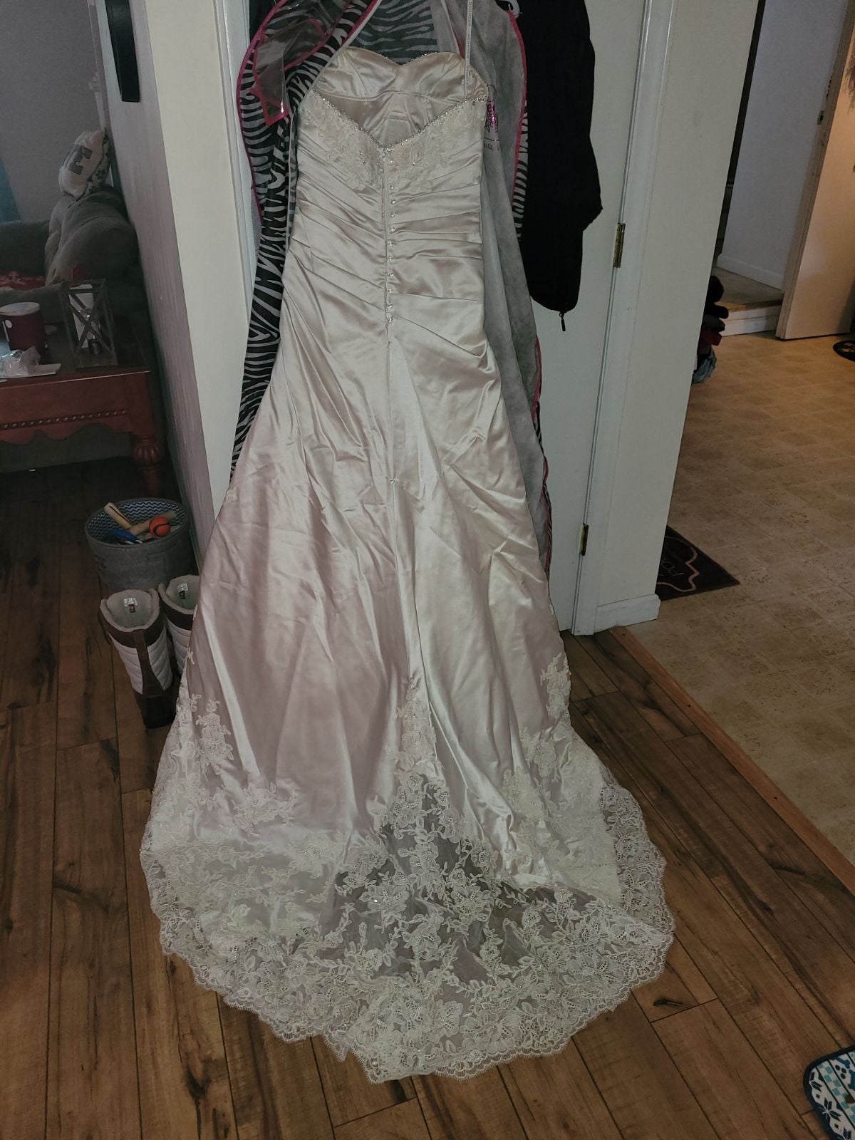 Ivory wedding dress bought in 2013, worn once. One of a kind says size 10 but altered and is now size 4. Needs to be cleaned, includes bussel. Gorgeous lace and crystals. Paid 1500