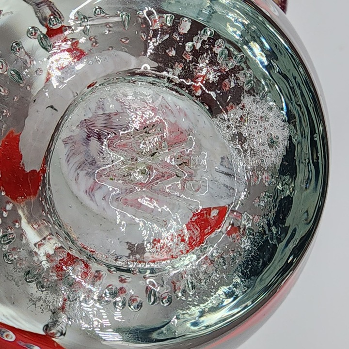 This Wheaton Poinsettia Glass Paperweight in red, white, and blue is a vintage masterpiece. It's adorned with intricate flower bubbles, adding unique charm to any decor.