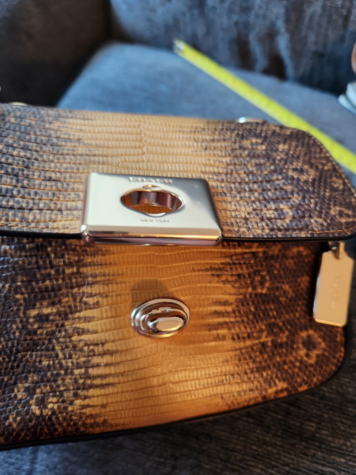 Mini Cassidy Crossbody Coach Purse Lizard Print mustard color with convertible shoulder or crossbody chain