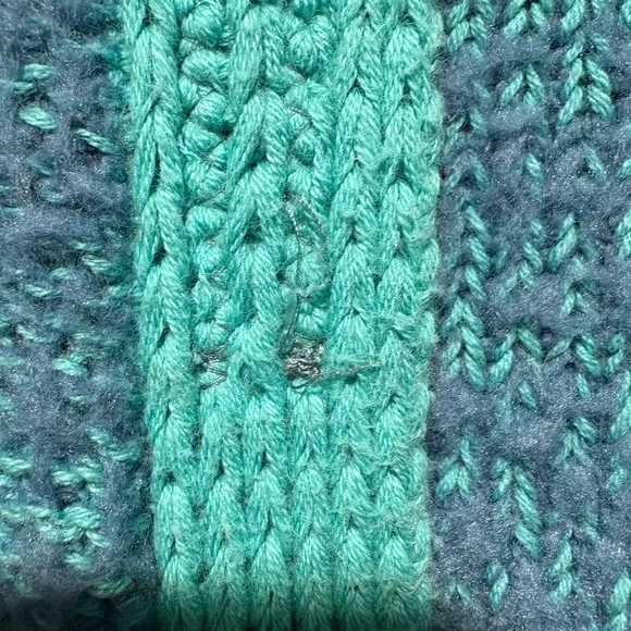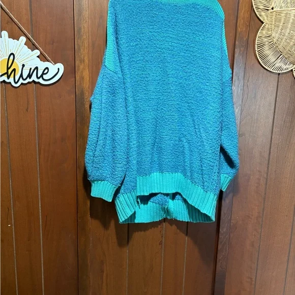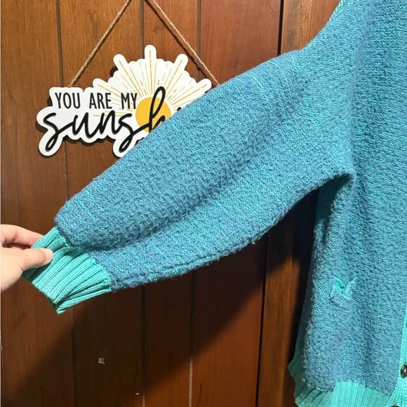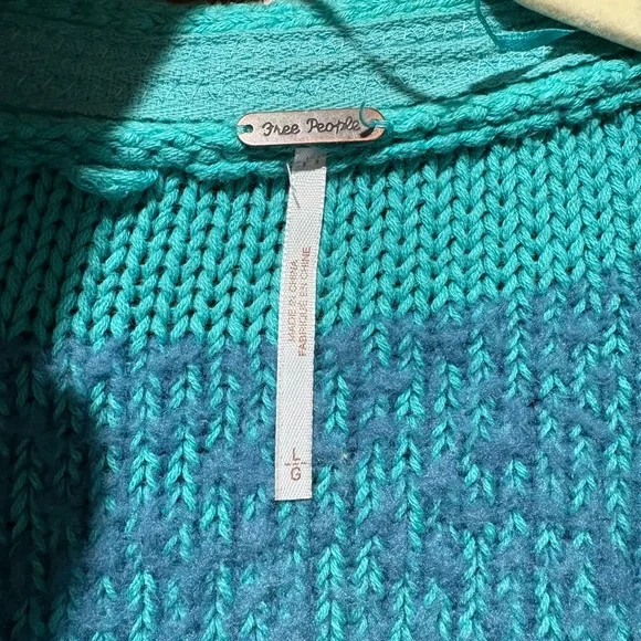 Embrace warmth and style with this Free People cardigan, featuring a vibrant blue hue and a relaxed, oversized fit. Its textured knit pattern and ribbed cuffs add a touch of elegance, making it perfect for cozy layering.Preowned condition. 57% cotton 17% nylon 15% polyester 14% one percent alpaca one percent elastane. Great sweater. Does have wash wear. See pictures for imperfections. Oversized. Still a Great sweater!